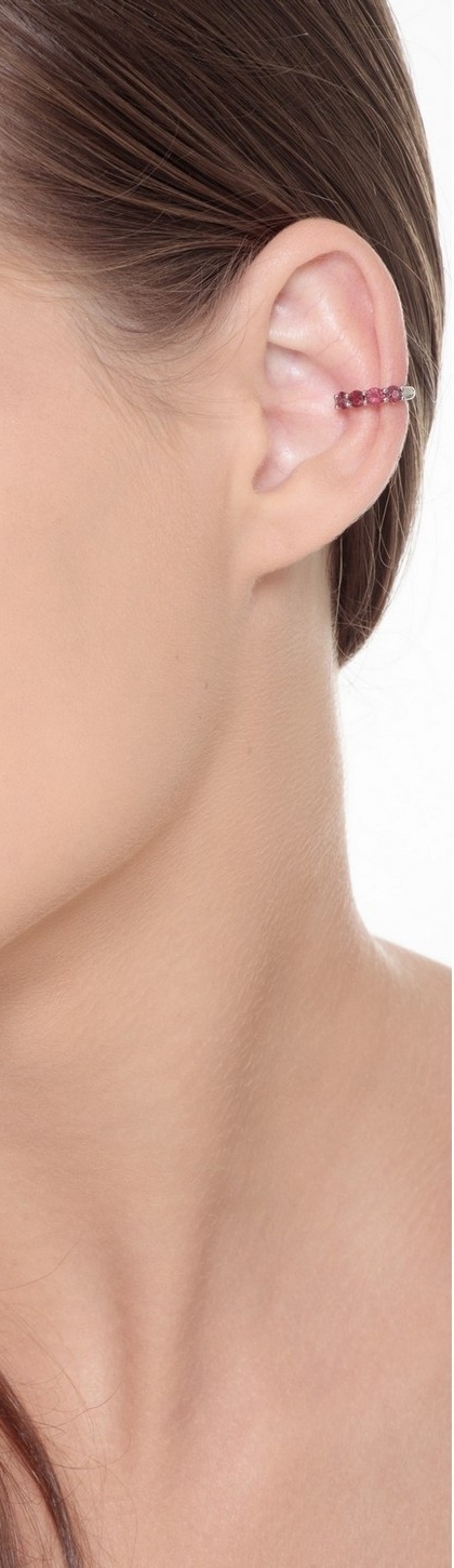 Mono orecchino da cartilagine in oro bianco 18k con incastonati rubini taglio brillante. Diametro interno 9 mm.