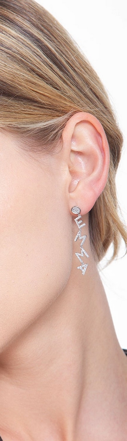 Mono orecchino pendente in oro bianco 18k, con la parola EMMA incastonata di diamanti taglio brillante colore G e Purezza Vs. Altezza orecchino 44 mm.