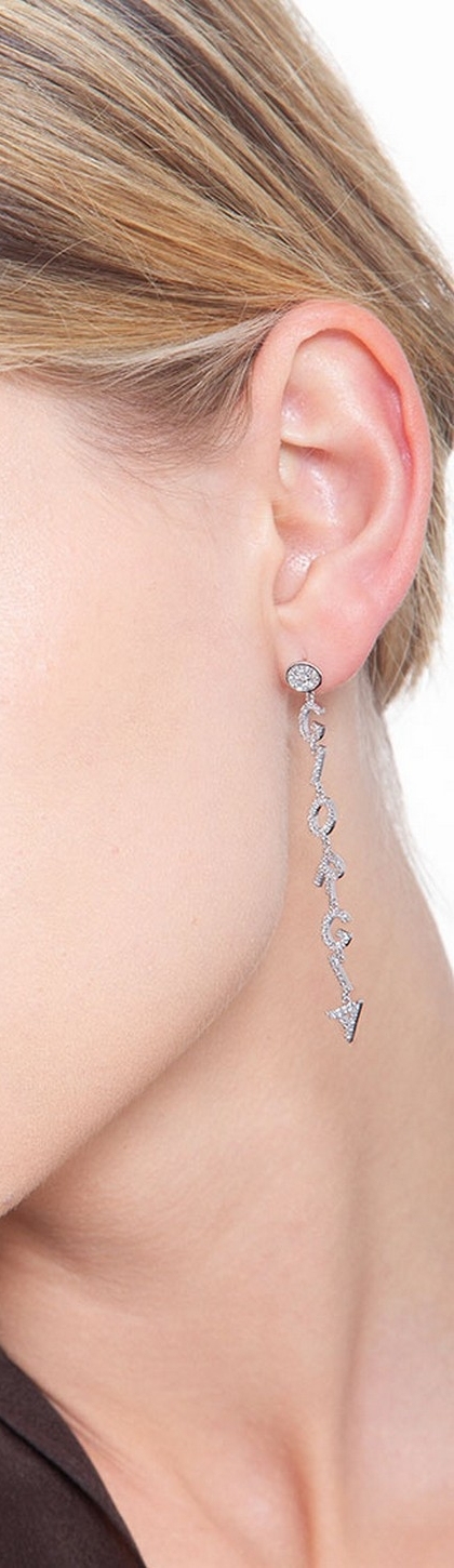 Mono orecchino pendente in oro bianco 18k, con la parola GIORGIA incastonata di diamanti taglio brillante colore G e Purezza Vs. Altezza orecchino 65 mm.
