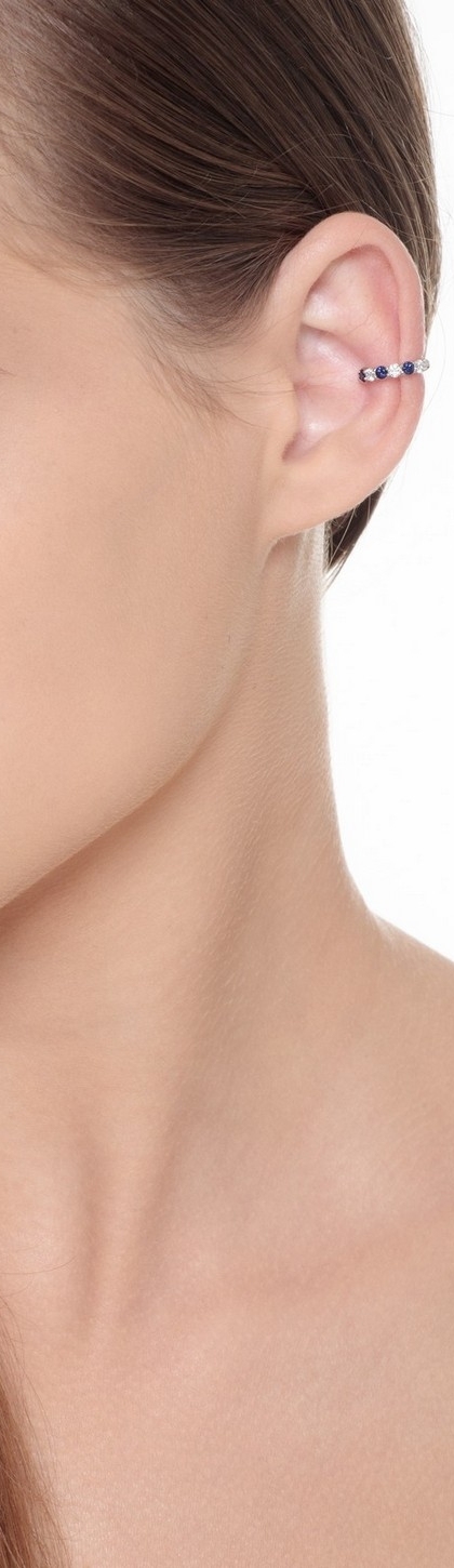 Mono orecchino da cartilagine in oro bianco 18k con incastonati diamanti taglio brillante, colore G e purezza Vs, alternati a zaffiri blu taglio brillante. Diametro interno 9 mm.