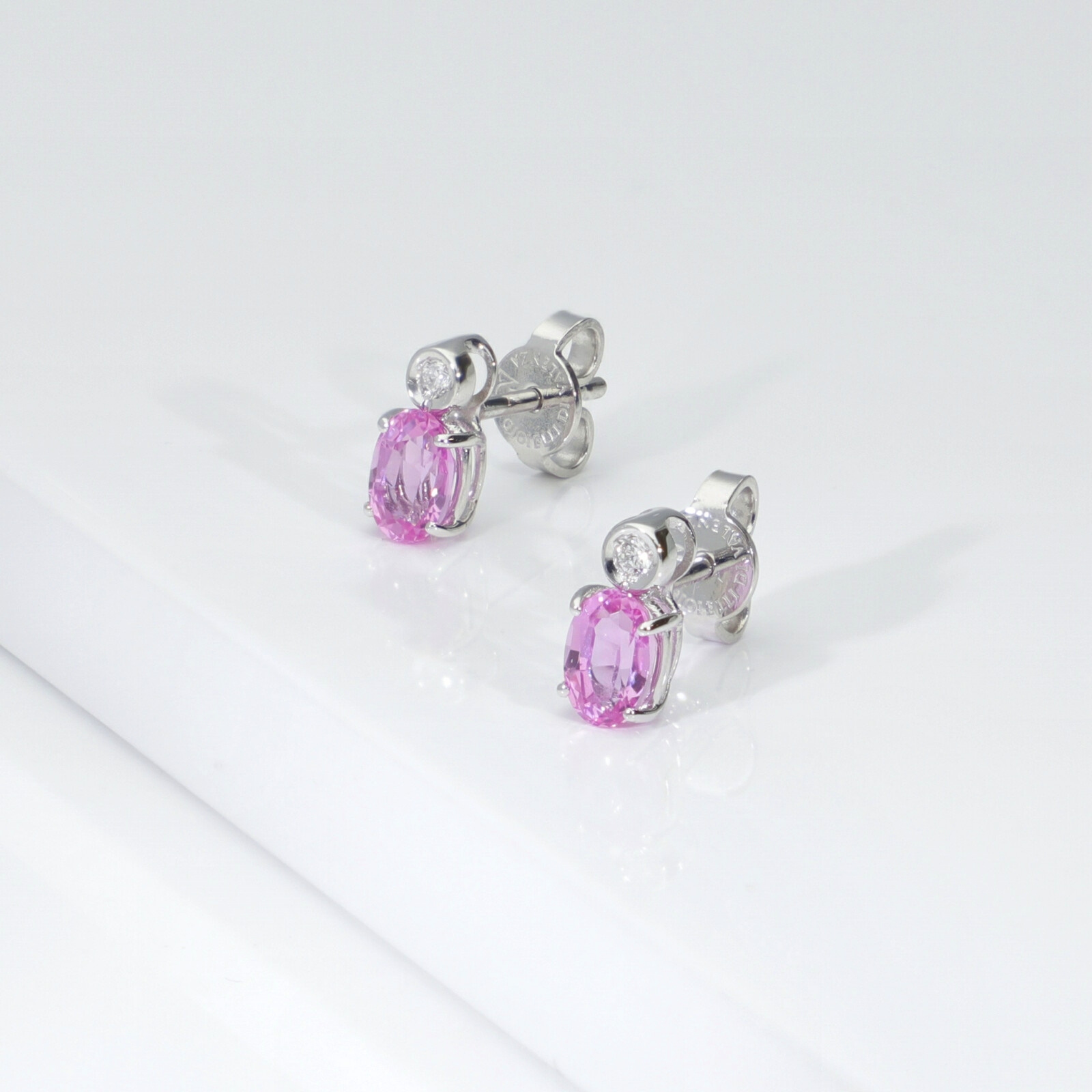 Orecchini a lobo in oro bianco 18k con zaffiro rosa taglio ovale e diamante taglio brillante, colore G e purezza Vs. Lo zaffiro misura circa 6x4 mm.