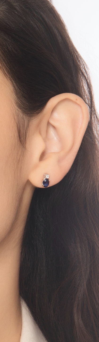 Orecchini a lobo in oro bianco 18k con zaffiri blu taglio ovale di circa 6x4 mm e castone con diamante taglio brillante, colore G, purezza Vs.