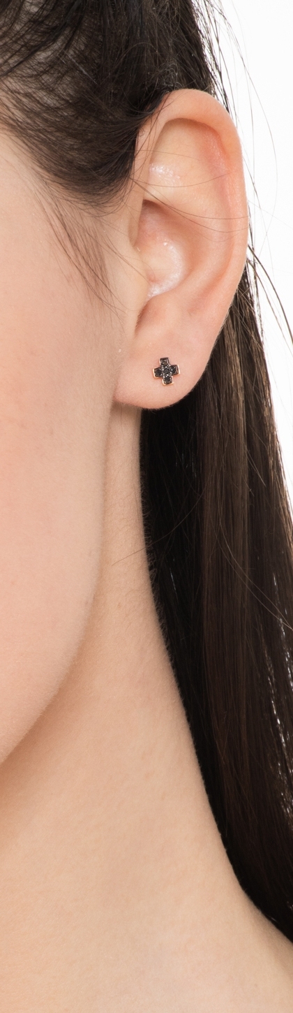 Orecchini a lobo in oro rosa 18k con piccola croce in diamanti neri