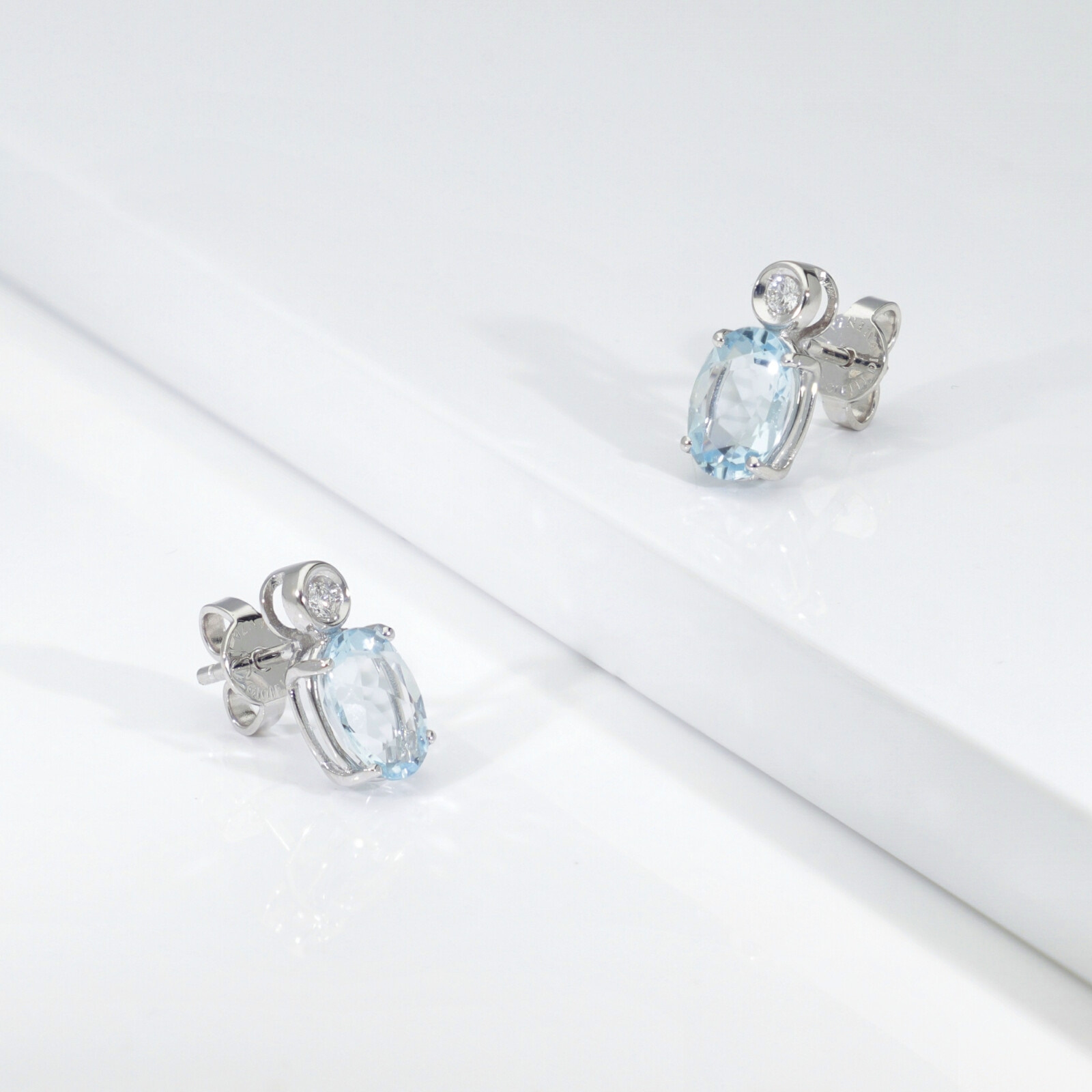 Orecchini a lobo in oro bianco 18k con acquemarine taglio ovale di circa 8x6 mm e castone con diamante taglio brillante, colore G, purezza VS.