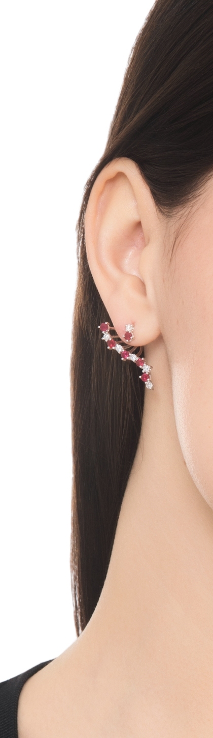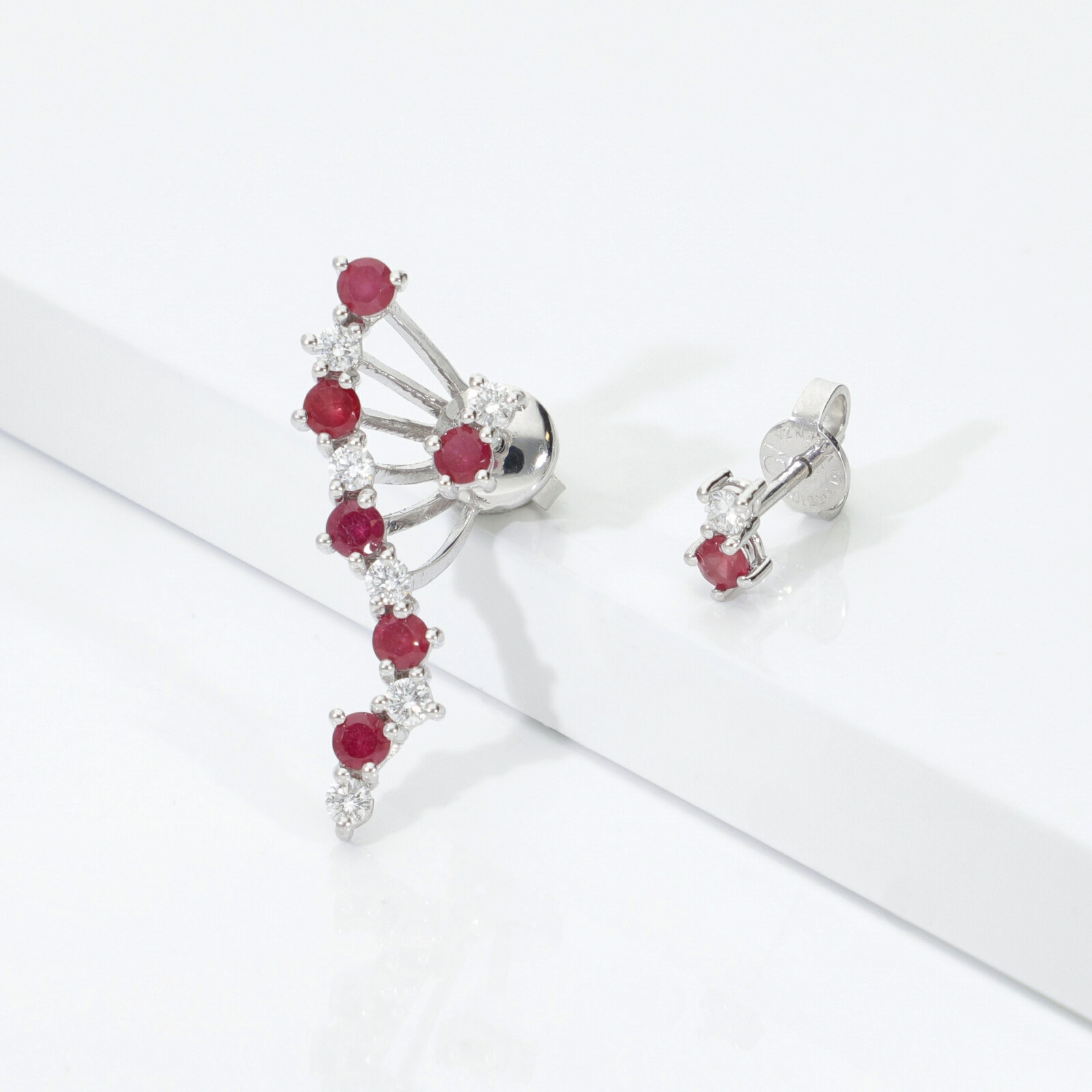 Orecchini in oro bianco 18k con rubini taglio tondo e diamanti taglio brillante, colore G, purezza Vs. Gli orecchini sono composti da un orecchino punto luce e un orecchino asimmetrico design in rubini e diamanti. L’orecchino dal design asimmetrico misura circa 2.7 cm ed è pensato per essere indossato a destra.