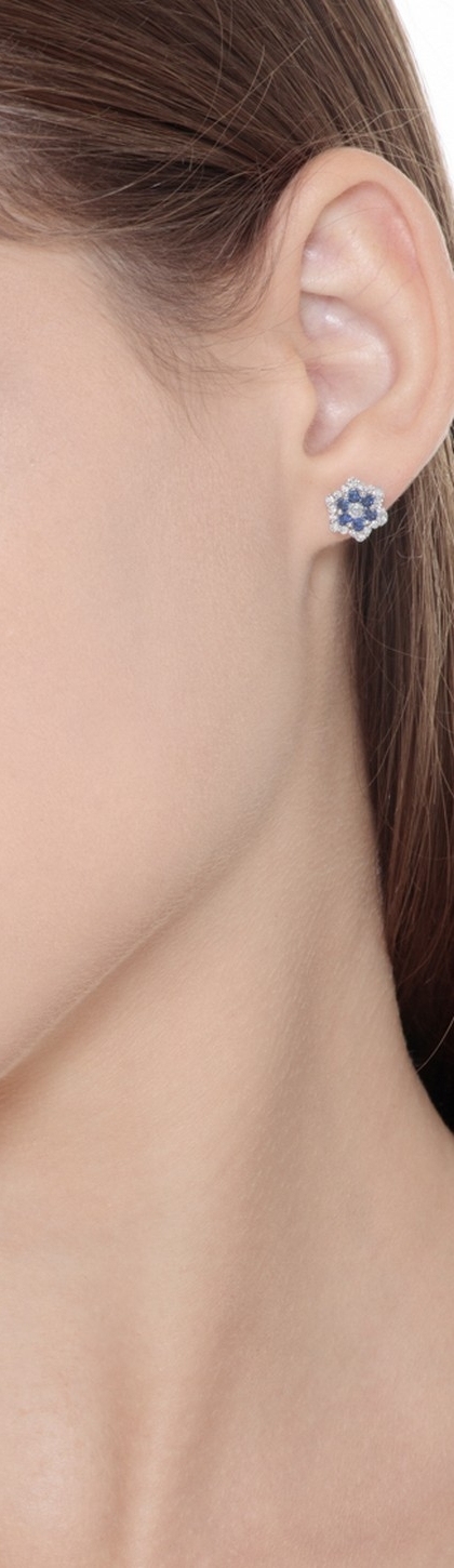 Orecchini in Oro bianco con Fiori impreziositi da diamanti taglio brillante di colore G e Purezza Vs e da Zaffiri Blu taglio brillante. Gli orecchini misurano 10 mm di diametro.