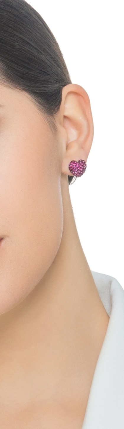 Orecchini in oro bianco 18k con cuore bombato in pavè di rubini