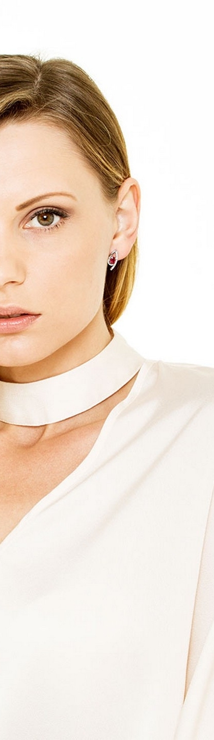 Orecchini in oro bianco 18k con rubini ovali e diamanti, 1,5 cm