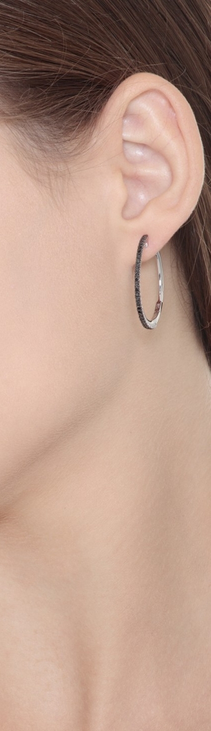 Orecchini a cerchio in oro bianco 18k con diamanti neri, diametro 3 cm