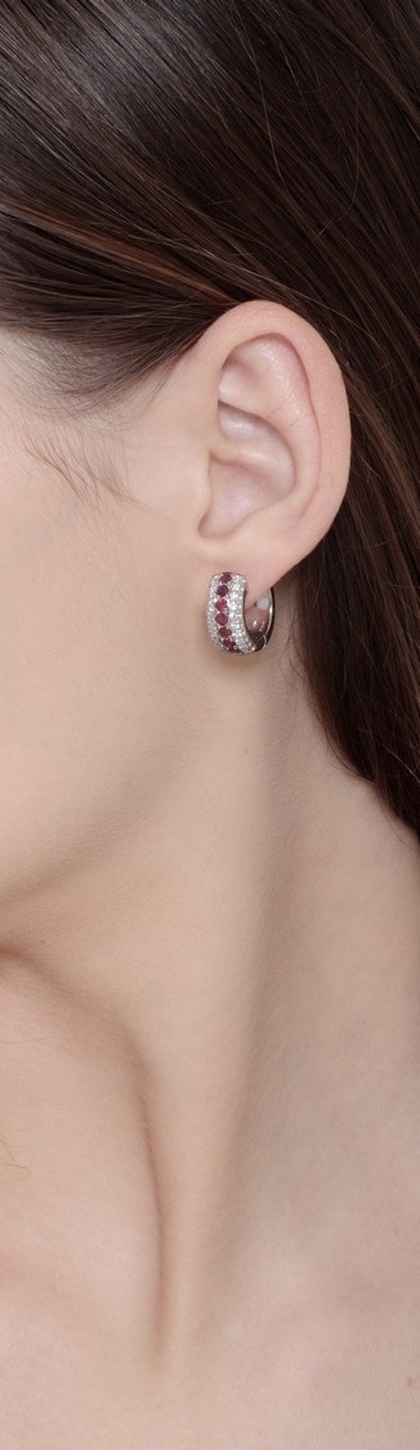 Orecchini a cerchio in oro bianco 18k con rubini e diamanti.