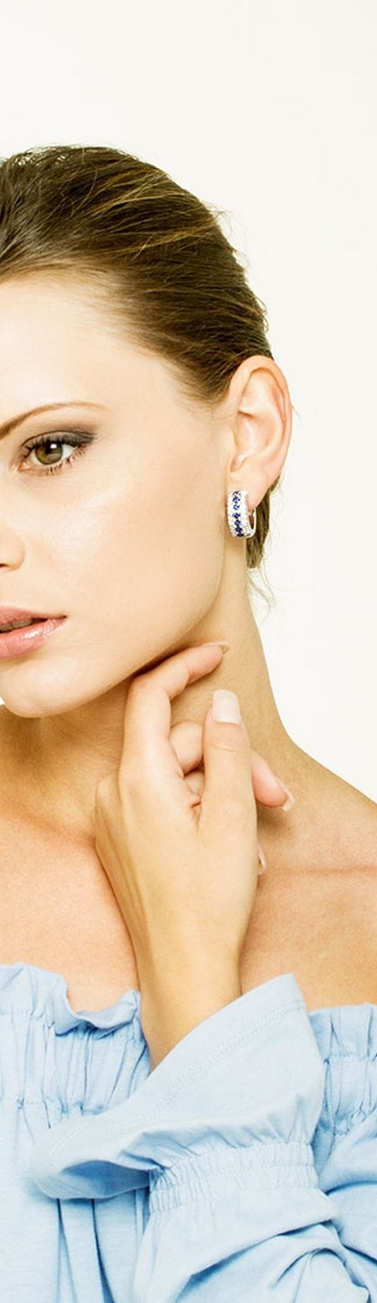 Orecchini a cerchio in oro bianco 18k con Zaffiri blu al centro e diamanti.