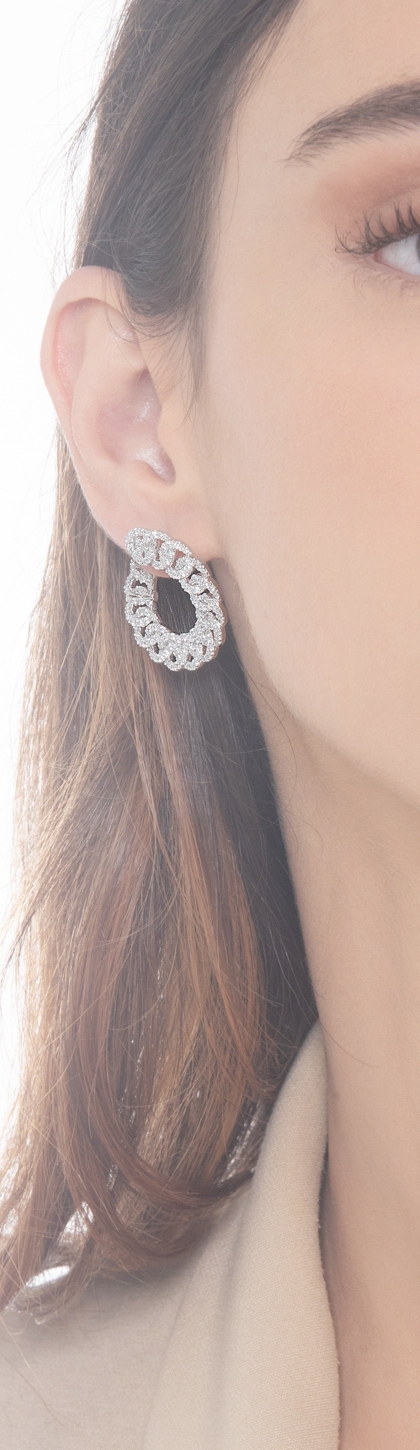 Orecchini a cerchio maglia groumette in oro bianco 18k con diamanti. Diametro circa 2.65 cm