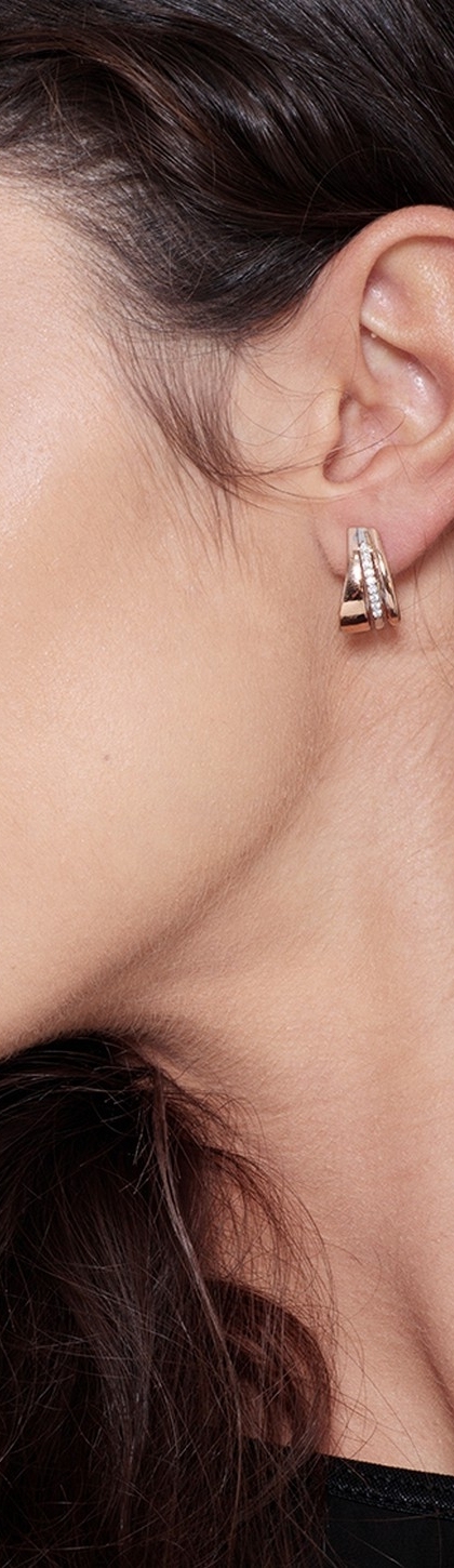 Gli orecchini sono formati da due fasce lisce in oro rosa di differenti larghezze a cui se ne aggiunge una centrale in oro bianco e in diamanti. I diamanti bianchi hanno taglio brillante, colore G e Purezza VS danno luce al volto senza risultare eccessivi.Gli orecchini misurano circa 1.6 cm.