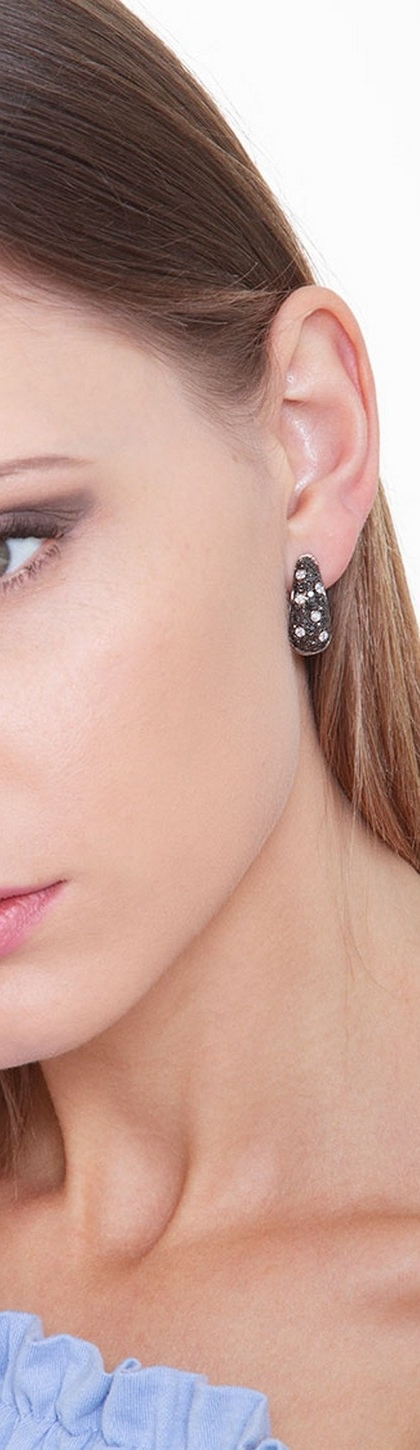 Orecchini modello a cerchio in oro bianco 18k, con incastonati diamanti taglio brillante colore G e purezza Vs contornati da diamanti neri taglio brillante incastonati su oro brunito.