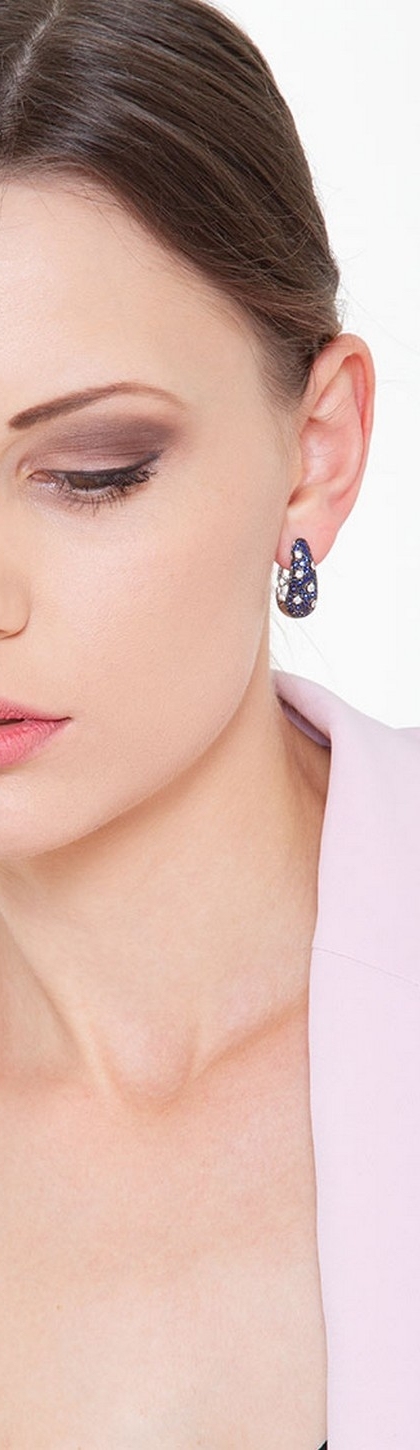 Orecchini in Oro Bianco 18k con Diamanti e Zaffiri blu su pavè brunito.