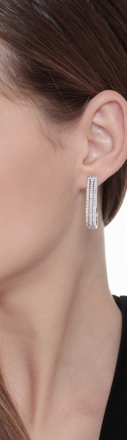 Orecchini ovali a 3 file parallele in oro bianco 18k con diamanti.