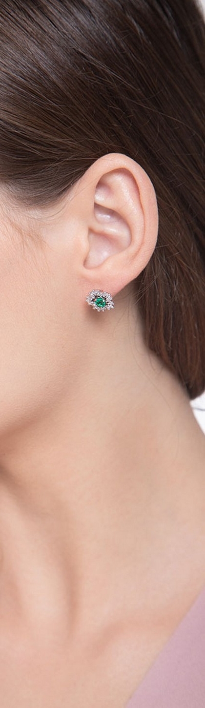 Orecchini in oro bianco 18k, con smeraldi centrali taglio brillante contornato da diamanti colore G e purezza Vs.