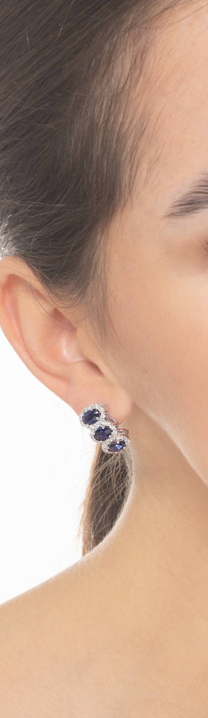 Orecchini in oro bianco 18k con 3 zaffiri blu ovali e diamanti.