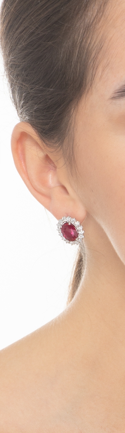 Orecchini in oro bianco 18k con rubini ovali e diamanti a contorno.