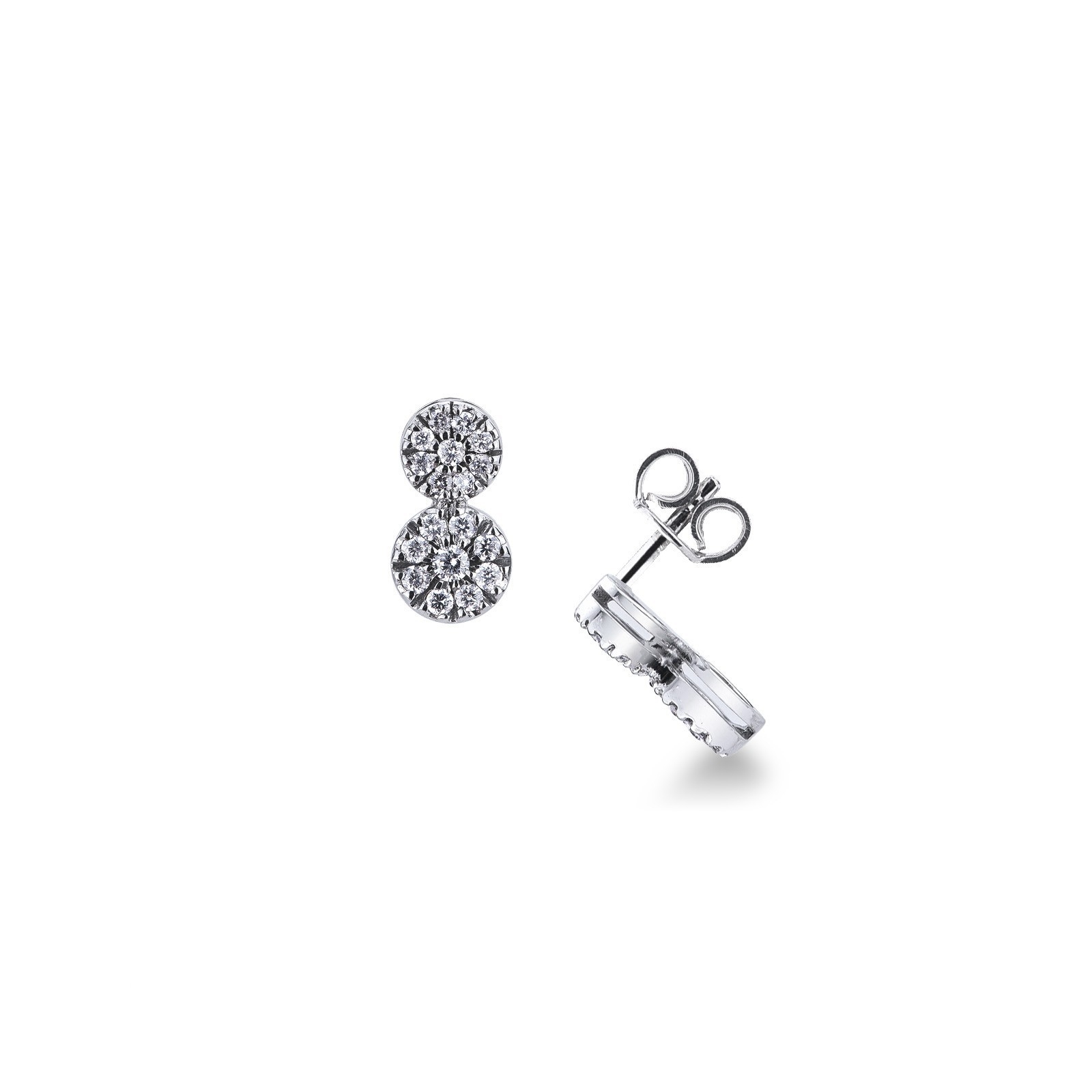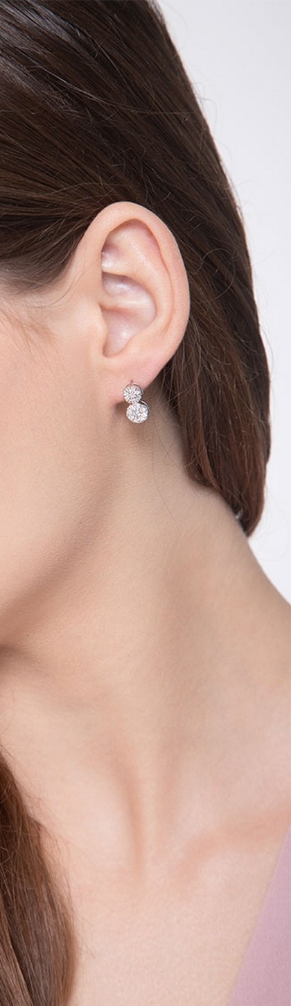 Orecchini a doppio bottone in oro bianco 18k con diamanti.