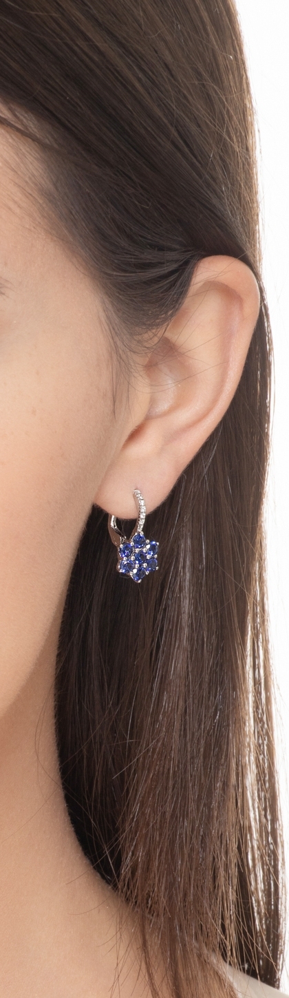 Orecchini a fiore in oro bianco 18k con zaffiri blu e diamanti sul gambo