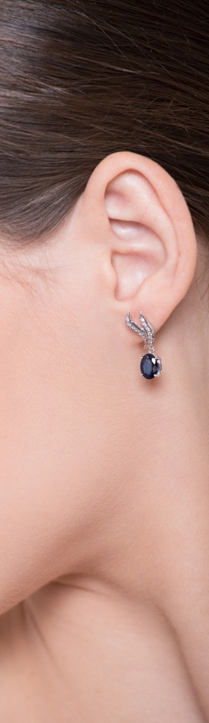 Orecchini con pendente e fiamme in oro bianco 18k con diamanti e zaffiri blu
