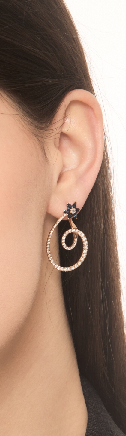 Orecchini design in oro rosa 18k con fiore zaffiri blu e diamanti