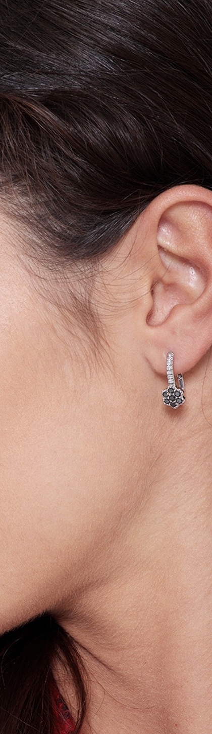 Orecchini in oro bianco 18k a monachella con incastonati diamanti neri taglio brillante e sullo stelo diamanti taglio brillante colore G e purezza Vs. Altezza orecchini 18 mm.