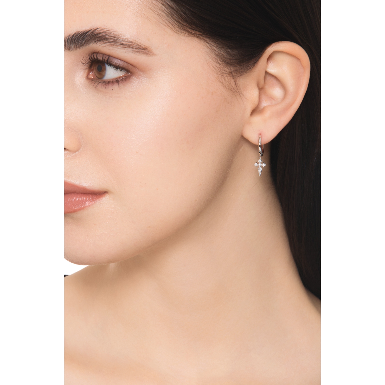 Orecchini in oro bianco 18k cerchio con pendente croce