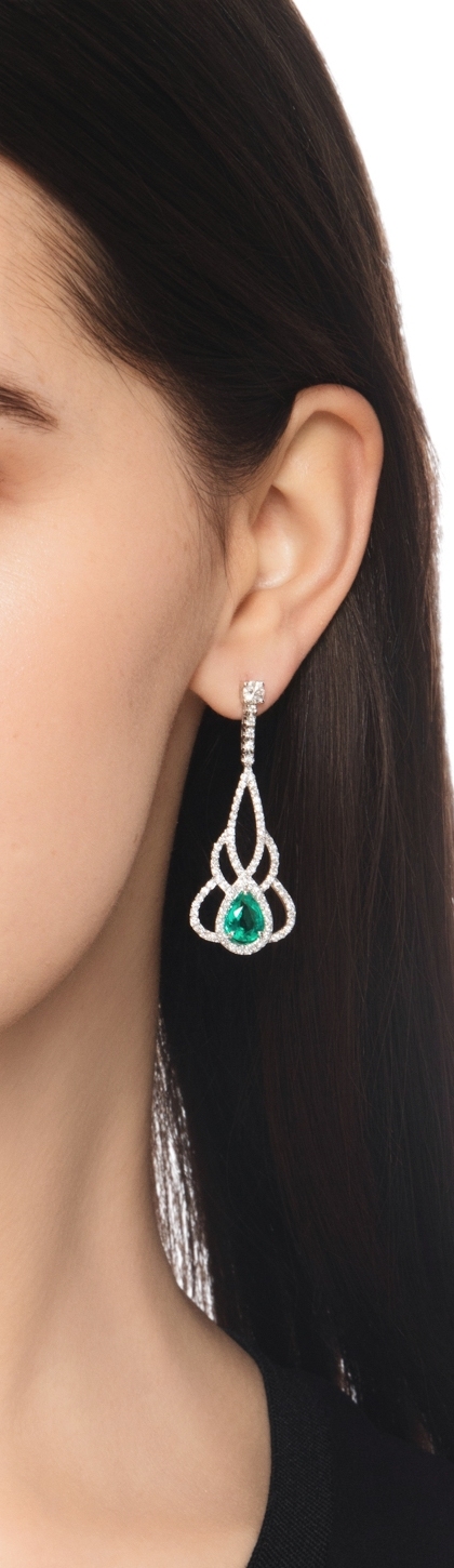 Orecchini in oro bianco 18k con diamanti e smeraldi a goccia.