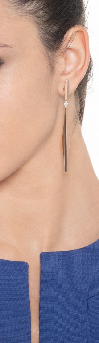 Orecchini pendenti a barretta in oro rosa e bianco 18k con diamanti a fiore.