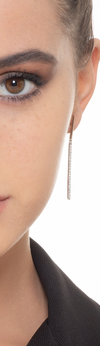 Orecchini pendenti a barretta in oro rosa e bianco 18k con diamanti.