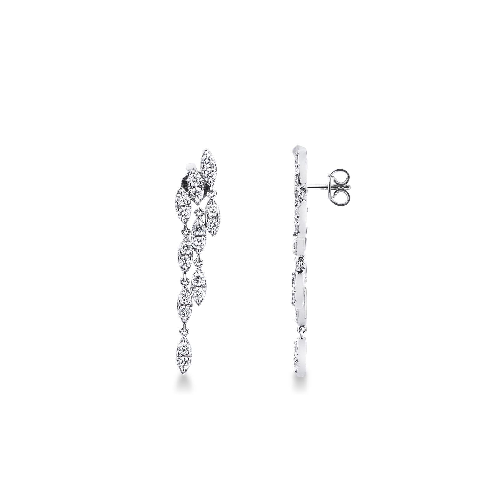 Orecchini pendenti a tre file in oro bianco 18k con diamanti