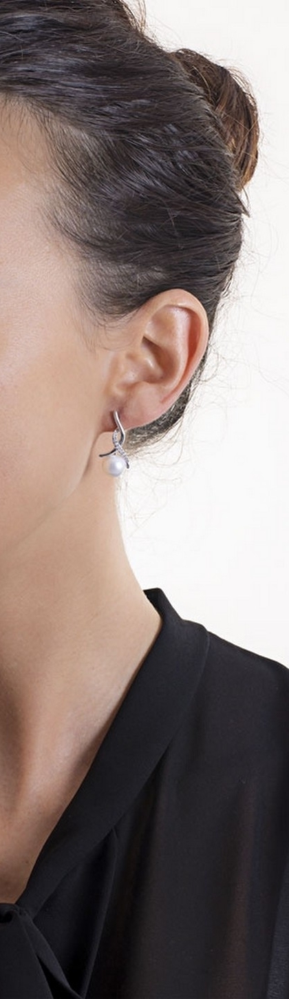Orecchini intrecciati in oro bianco 18k con perla e diamanti.