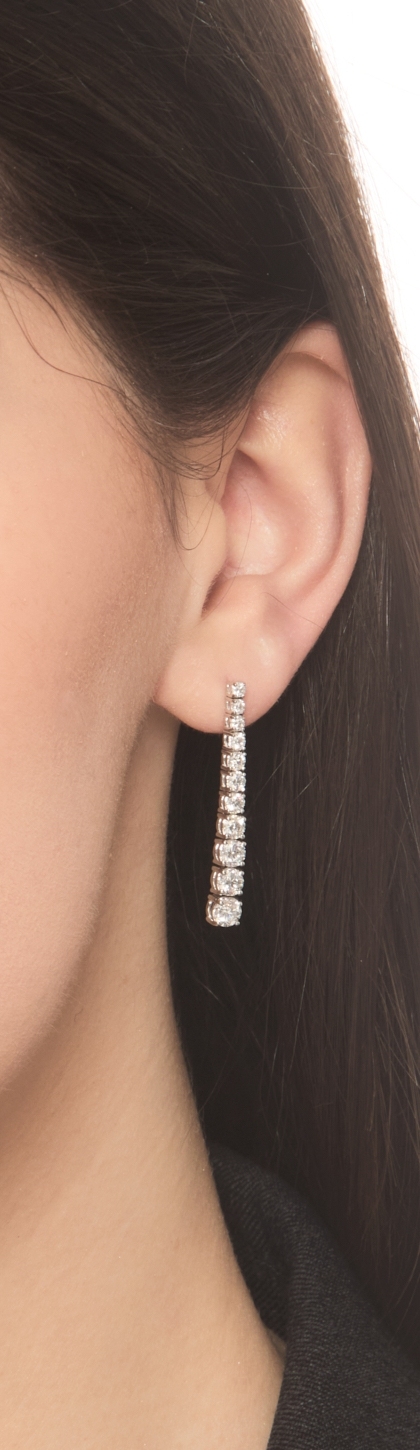 Orecchini tennis a scalare in oro bianco 18k con diamanti taglio brillante, colore G, purezza Vs. La lunghezza degli orecchini è di circa 3.5 cm.