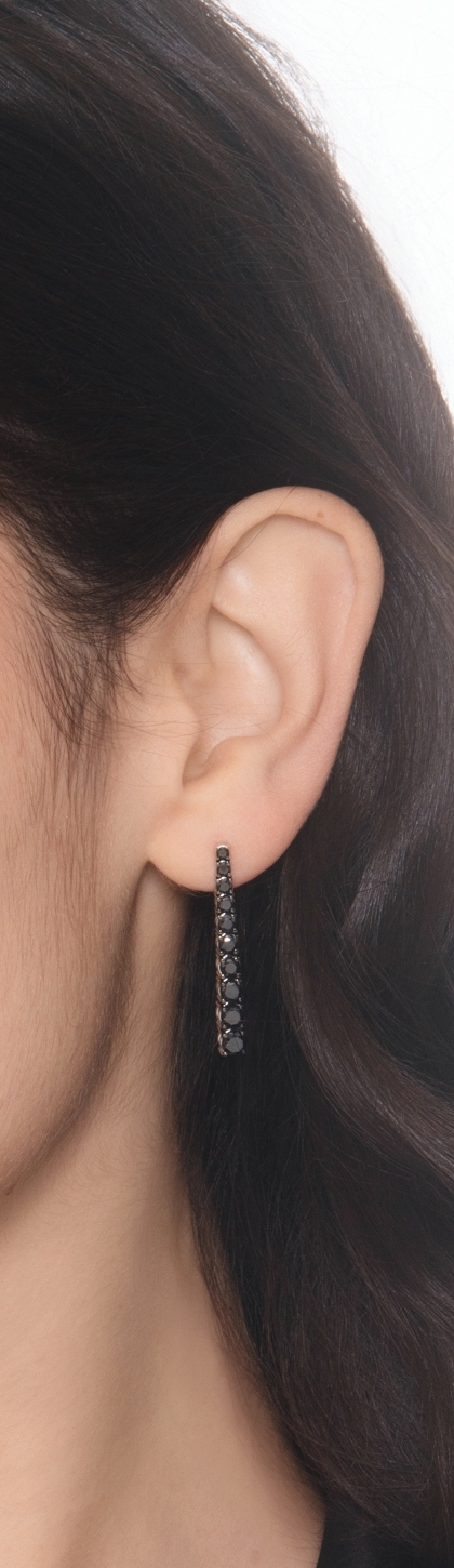 Orecchini tennis a scalare in oro bianco 18k con diamanti neri, gli orecchini hanno una lunghezza di circa 3.4 cm.
