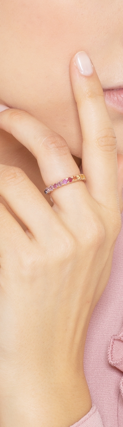 I colori vivaci degli zaffiri– blu profondo, rosa delicato, arancione caldo e giallo solare – si alternano armoniosamente lungo la fascia, creando un effetto cromatico unico e luminoso.