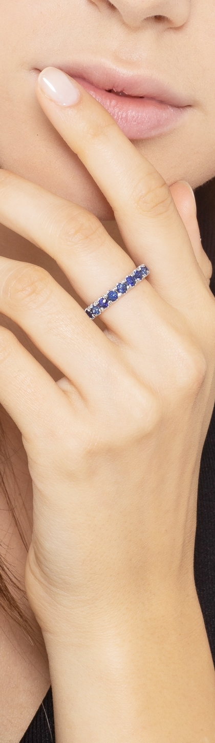 Anello modello Eternity a griffe in Oro Bianco 18k con Zaffiri Blu