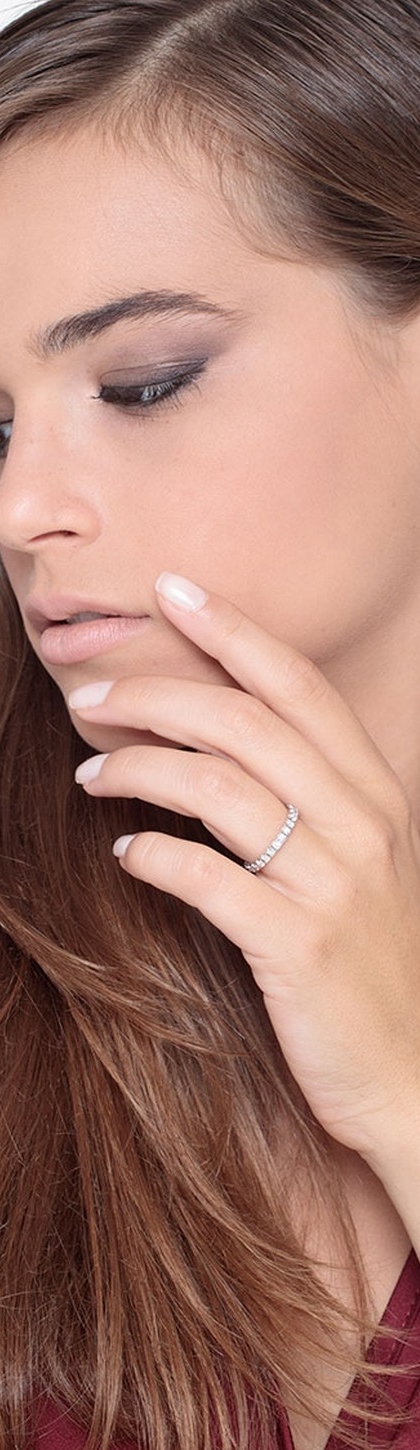 Anello Eternity a griffe in Oro bianco 18k, con incastonati diamanti taglio brillante colore G e purezza Vs.