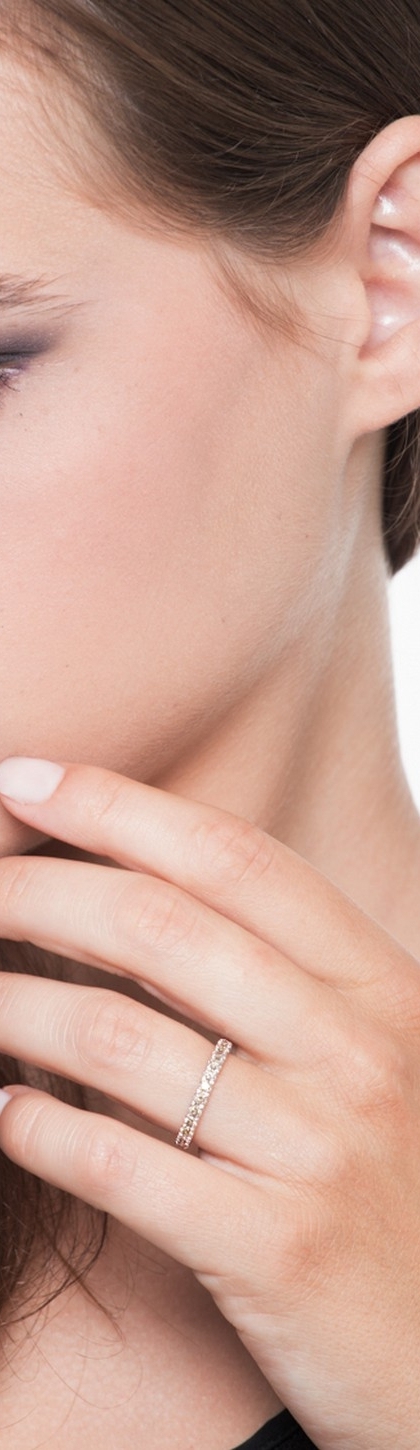 La caratteristica principale degli anelli eternity è la fascia interamente ricoperta da pietre preziose. Simbolo di amore eterno, si abbinano perfettamente alle fedi nuziali e possono essere indossati con qualsiasi outfit. Questo modello di Gioielli di Valenza, presenta diamanti brown sull'intera circonferenza. I diamanti brown sono spesso usati e apprezzati in gioielleria grazie al loro colore tenue, caldo e terroso. Inoltre, il taglio brillante dei diamanti di questo anello, permette alla luce di colpire in modo ottimale le pietre preziose rendendo l'anello visivamente più luminoso.