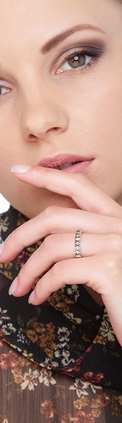 Gli anelli eternity presentano la fascia interamente ricoperta da pietre preziose. Simbolo di amore eterno, si abbinano perfettamente alle fedi nuziali e possono essere indossati con qualsiasi outfit. Questo modello di Gioielli di Valenza, presenta diamanti brown sull'intera circonferenza. I diamanti brown sono spesso usati e apprezzati in gioielleria grazie al loro colore che va dal light champagne al cognac, rendendoli molto versatili. Inoltre, il taglio brillante dei diamanti di questo anello, permette alla luce di colpire in modo ottimale le pietre preziose rendendo l'anello luminoso.