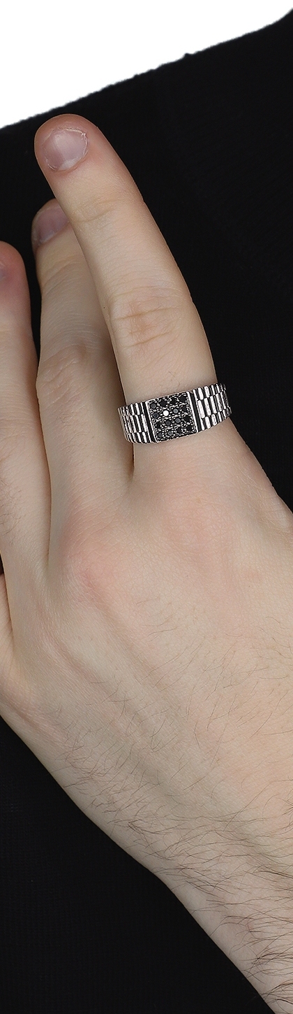 Anello a fascia da uomo in oro bianco 18k con pavè rettangolare in diamanti neri.