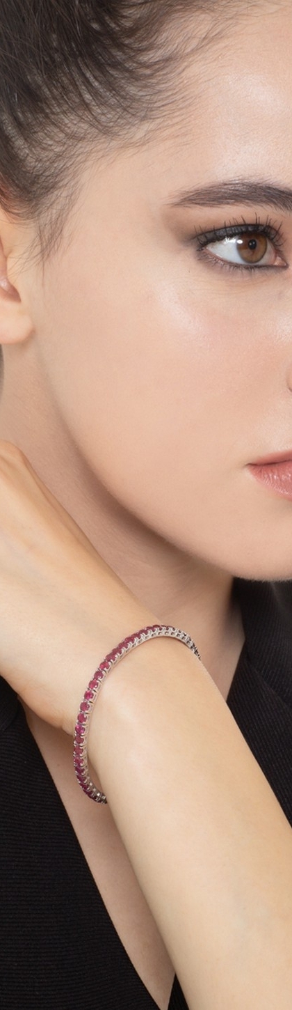 Bracciale tennis a griffe in oro bianco 18k con incastonati rubini taglio brillante. Larghezza 3.30 mm circa.