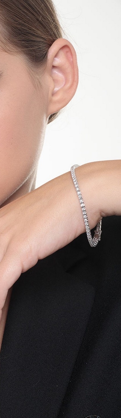 Bracciale Tennis a griffe in Oro Bianco 18k con incastonati diamanti colore G e purezza Vs. la caratura potrà variare in base alla misura del bracciale. Larghezza maglia 3,00 mm circa