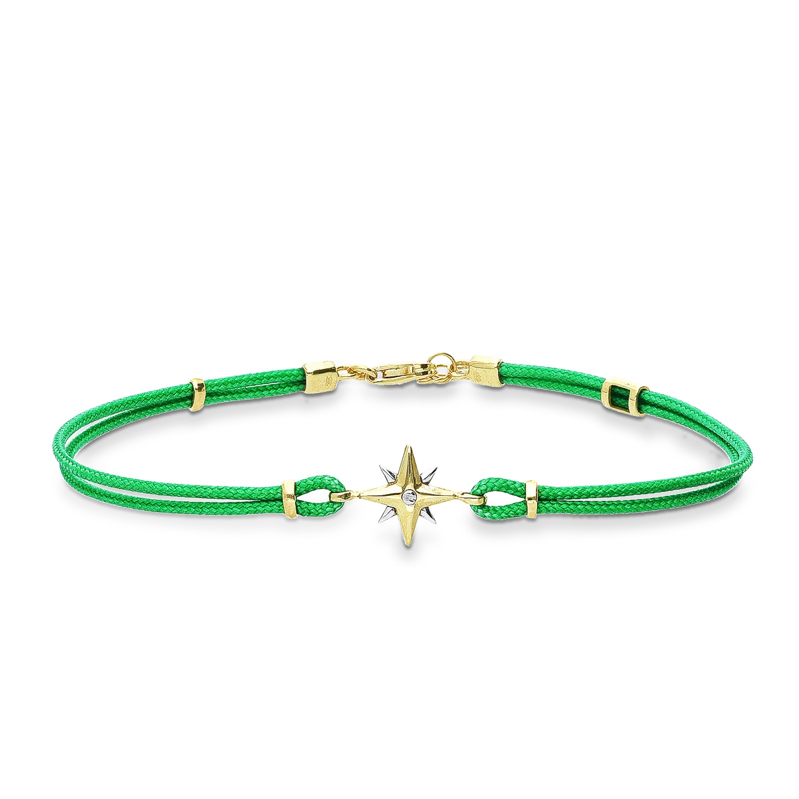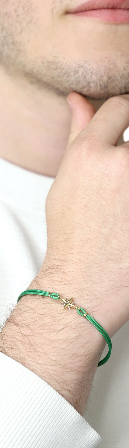 La rosa dei venti è a 8 punte in cui si alternano oro bianco e giallo, mentre il cordino verde è impreziosito da dettagli in oro giallo 18k.