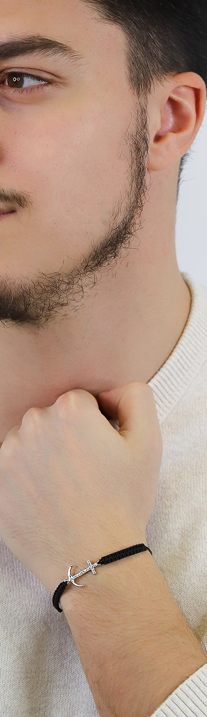 Bracciale in tessuto nero con ancora in oro bianco 18k e diamanti, Uomo