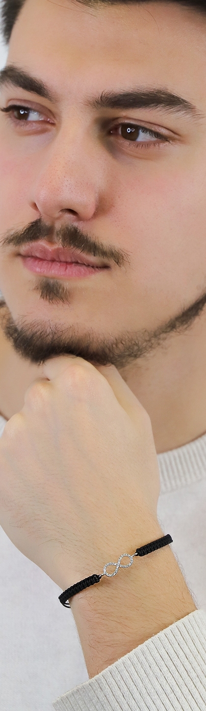 Bracciale in tessuto nero con simbolo infinito in oro bianco 18k e diamanti, Uomo