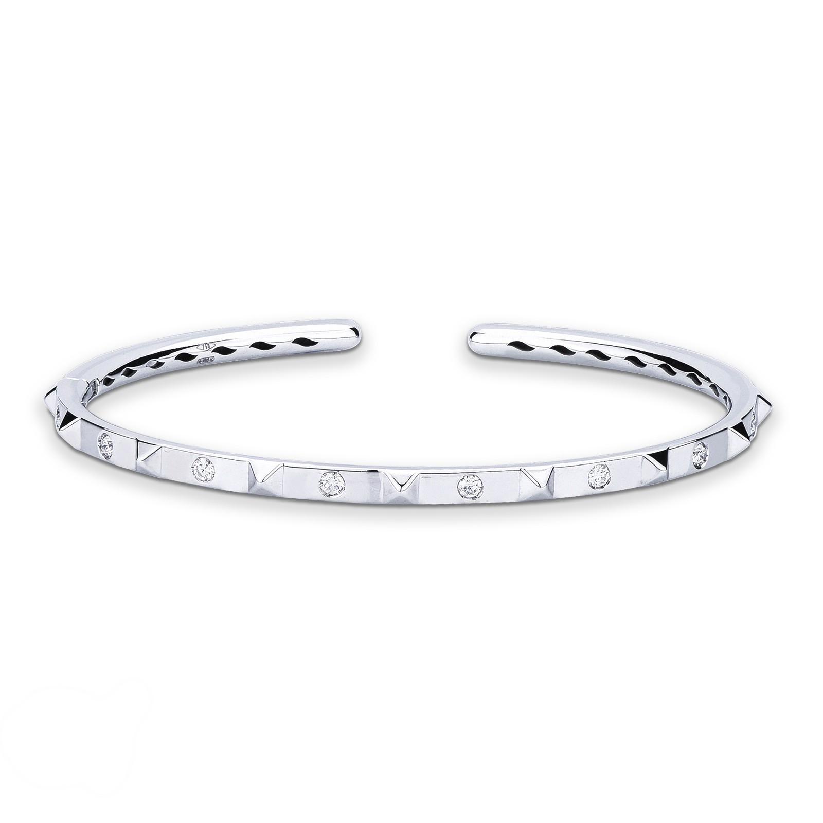 Bracciale rigido in oro bianco 18k con borchie e diamanti taglio brillante, colore G, purezza Vs. Taglia L 6.5x5.5 cm.