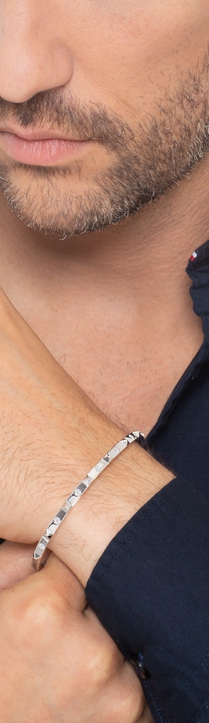 Bracciale rigido in oro bianco 18k con borchie e diamanti, misura uomo