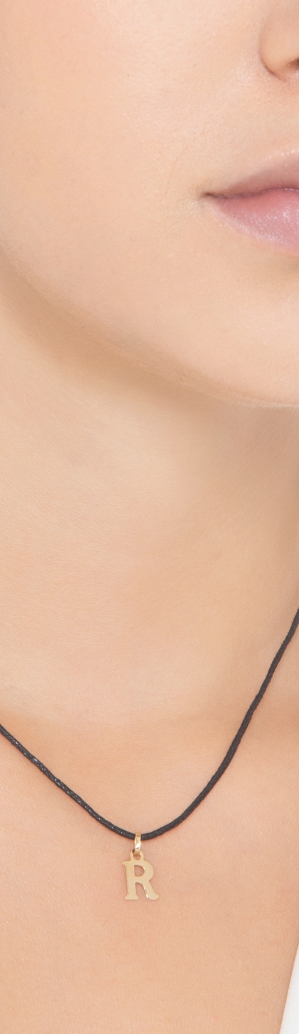 Ciondolo con lettera iniziale R stampatello in oro giallo 18k
